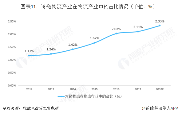 在整個物流行業中,相對于規模龐大的航空物流、工業物流等主要物流模式,冷鏈物流規模較小,但是冷鏈物流的重要性卻毫不遜色。2017-2018年,國務院辦公廳、國務院安全委員會、工信部、公安部等20余個國家部委出臺了15部涉及冷鏈物流產業的政策規劃,將冷鏈物流產業作為保障食品和民生安全的重要手段。冷鏈物流行業市場規模整體增速要快于物流行業市場規模增速,冷鏈物流產業在物流行業中的占比也逐年增長,冷鏈物流產業的價值和地位愈發凸顯。