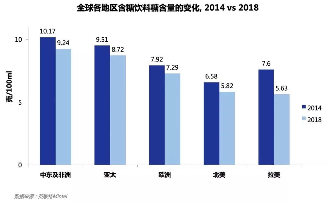 到2020年,為產(chǎn)品減糖仍將是飲料制造商面臨的首要任務(wù)。據(jù)英敏特?cái)?shù)據(jù),全球各地區(qū)含糖飲料糖含量都有不同程度的降低(2014-2018年),特別在亞太地區(qū),糖含量降低了8.3%。