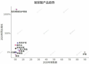 玻尿酸產(chǎn)品發(fā)展至今,主要還是集中在護(hù)膚領(lǐng)域。雖然也有口服的保健品,但銷售額僅排在第五名。排在前面的護(hù)膚和醫(yī)美,是常見的玻尿酸用途,暫且不提,但成人用品和美發(fā)護(hù)發(fā)產(chǎn)品的銷售額和同比增長比保健品還高,就讓人非常驚訝了。