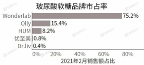 今年2月,市面上已經(jīng)出現(xiàn)了一款玻尿酸食品——代餐品牌WonderLab推出的玻尿酸軟糖。 上市一個(gè)月后,WonderLab表現(xiàn)不俗,立刻搶下了第一名,把其他品牌遠(yuǎn)遠(yuǎn)甩在后面。要知道2020年,HUM的市占率達(dá)到了61%,Olly的市占率達(dá)到了38%。