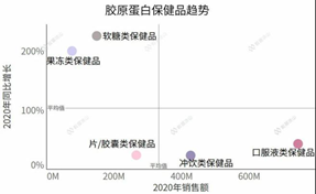 可以發(fā)現(xiàn),除了餅干薯片外,其他產(chǎn)品大多是比較水潤、粘稠或有彈性的,加工過程較為健康,與膠原蛋白成分的形象比較類似。