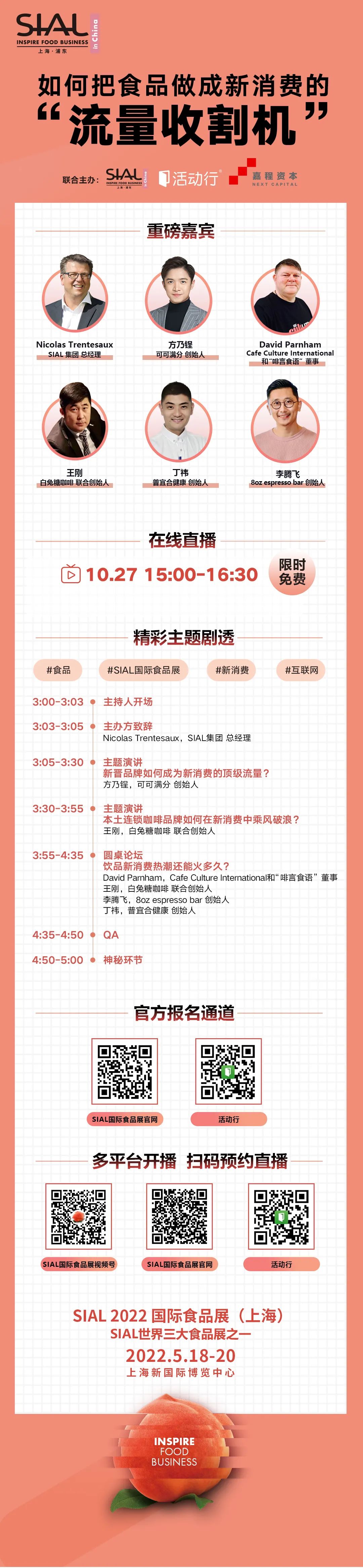食品新消費(fèi)千億市值品牌需要新的視野與打法。SIAL自1964年巴黎成立以來(lái)一直通過(guò)SIAL 在線(xiàn)智庫(kù)(SIAL Think Tank)聚集全球最具創(chuàng)新力的食品品牌,為食品行業(yè)帶來(lái)前瞻性思考。10月27日(周三)下午3:00-5:00,SIAL在線(xiàn)智庫(kù)直播計(jì)劃正式開(kāi)啟,在第一期直播中,來(lái)自新消費(fèi)飲品的新銳品牌高管將分享:如何把食品做成新消費(fèi)的“流量收割機(jī)”