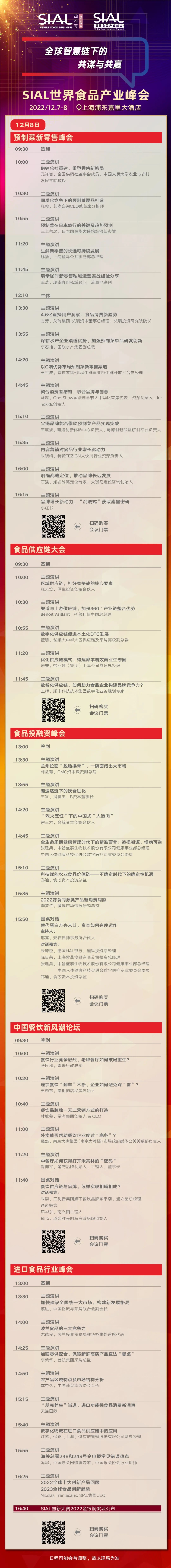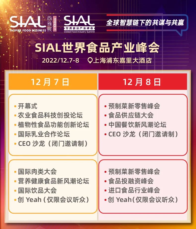 SIAL世界食品產(chǎn)業(yè)峰會(huì)將于2022年12月7日-8日如期舉辦!峰會(huì)將以“全球智慧鏈下的共謀與共贏”為主題舉辦包含預(yù)制菜、新零售、供應(yīng)鏈、農(nóng)業(yè)食品科技、食品投融資、營(yíng)養(yǎng)健康食品、植物性食品、乳業(yè)、肉類(lèi)、飲品、中餐、進(jìn)口食品在內(nèi)的多場(chǎng)主題論壇。