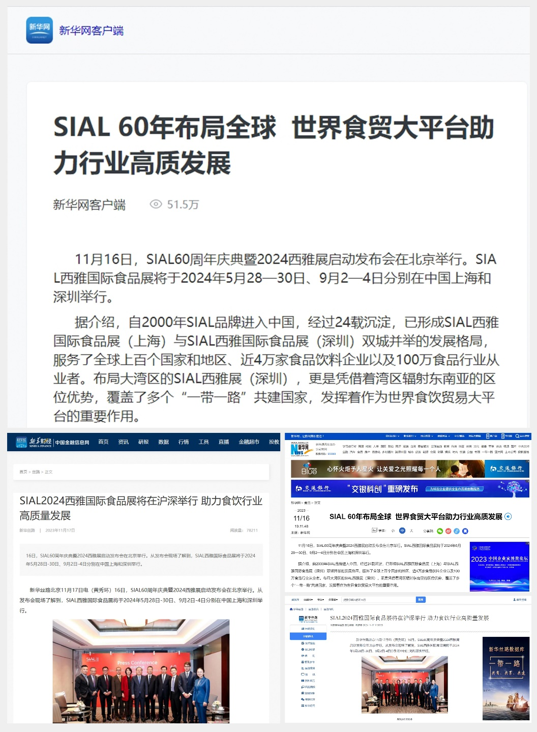 11月16日,SIAL60周年慶典暨2024西雅展啟動發布會在京舉行。隨后一條題為“SIAL 60年布局全球 世界食貿大平臺助力行業高質發展”的消息迅速被新華網、人民網、環球網、CHINA DAILY等主流官媒以及一眾行業媒體競相報道,百余媒體強勢聚焦,SIAL西雅展影響力再破圈。